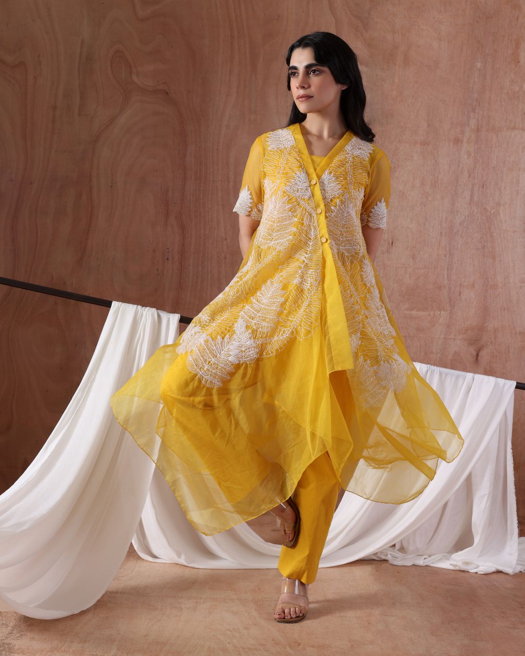 A radiant mustard-yellow ensemble featuring a delicately embroidered longline jacket with scalloped edges and sheer side panels. Paired with straight-cut pants, the look strikes a balance between lightness and structure. The intricate ivory threadwork adds a touch of artisanal finesse, making it a versatile choice for festive gatherings or contemporary ethnic celebrations.