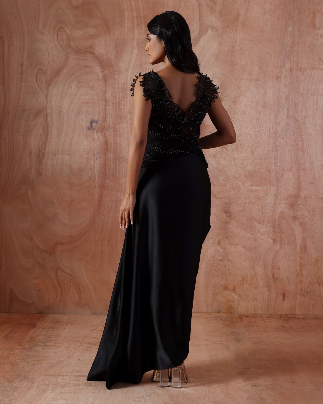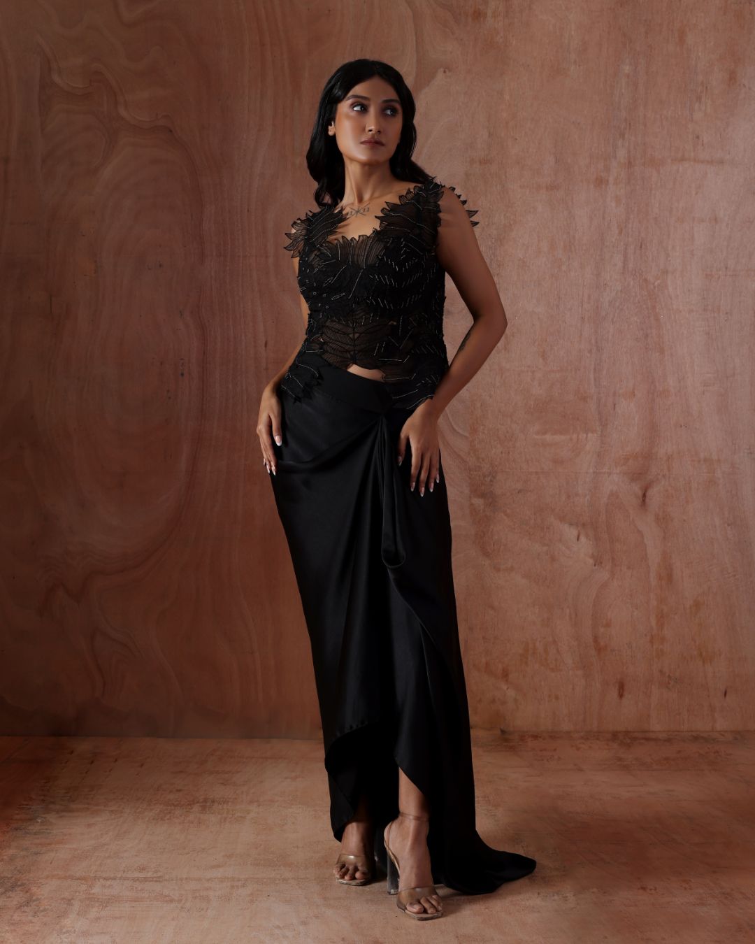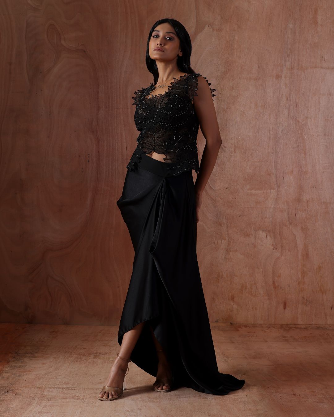 A sensuous black set featuring a statement top with intricate applique work embellished with pearls and a fluid draped skirt with an asymmetric hemline. This ensemble redefines evening wear with its refined craftsmanship and contemporary attitude—ideal for fashion-forward occasions.