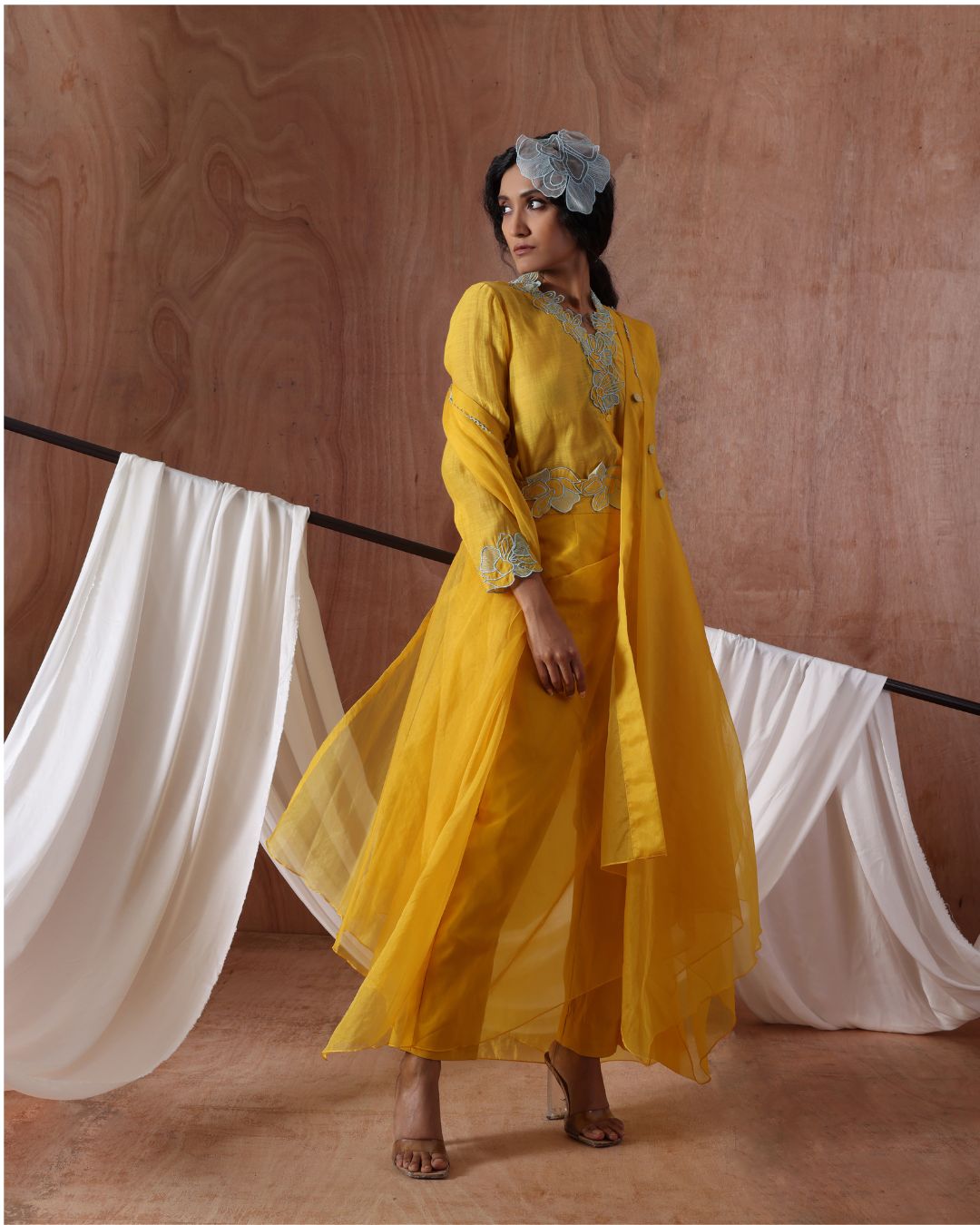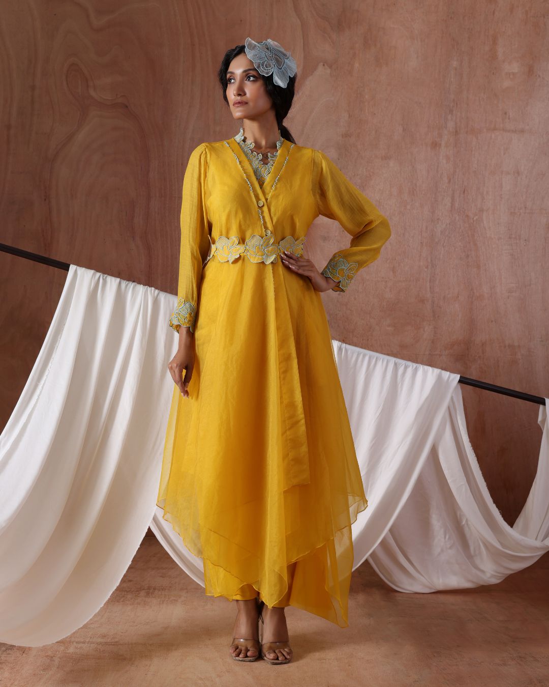 A sunshine yellow layered dress in airy sheer fabric, detailed with delicate embroidery at the waist and cuffs paired with a sculpted belt. The flowy asymmetric hemline adds movement and grace, while its fresh hue makes it perfect for daytime festivities, garden weddings, or light celebratory gatherings.